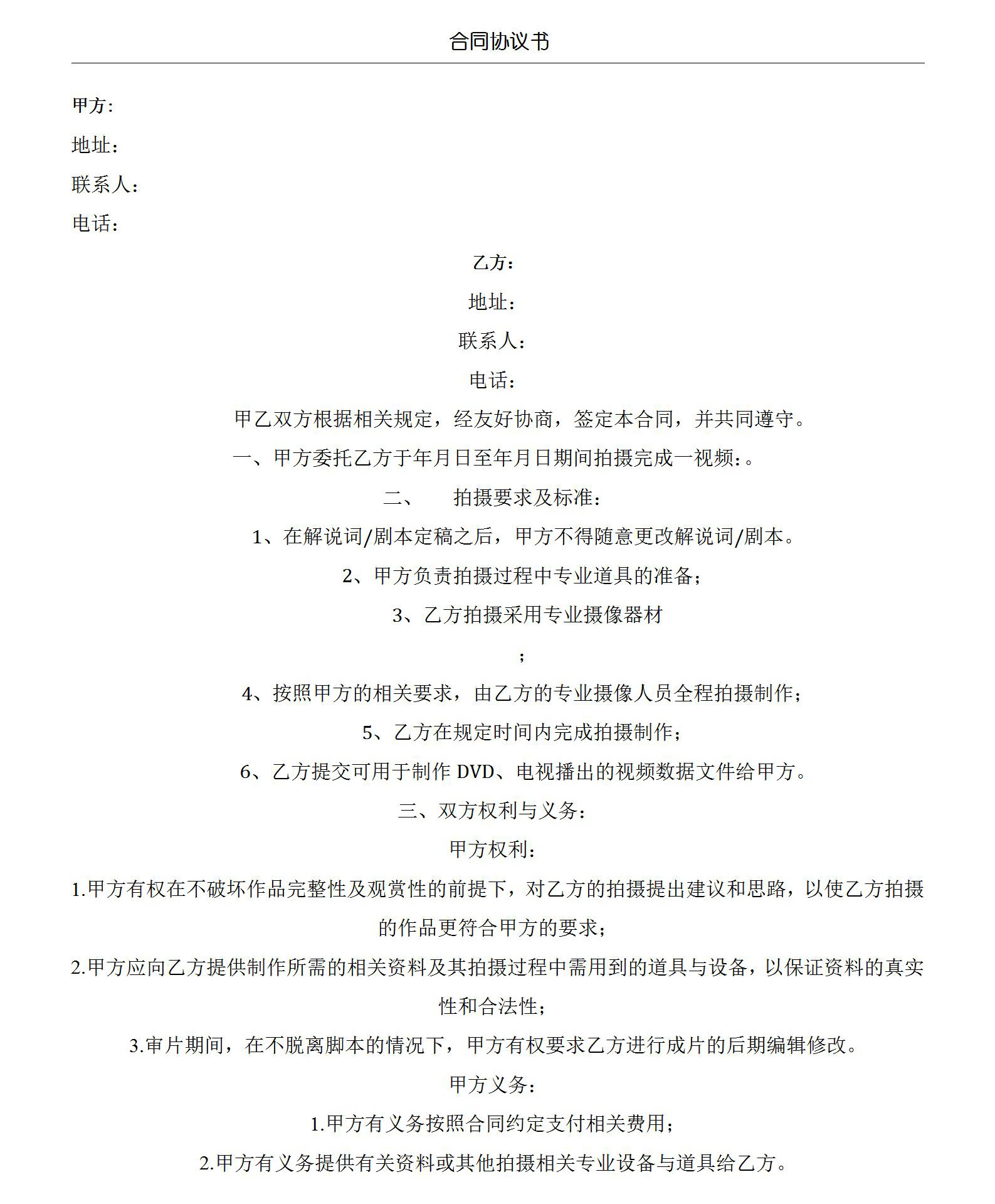 甲乙双方根据相关规定,经友好协商,签定本合同,并共同遵守。 一、甲方委托乙方于年月日至年月日期间拍摄完成一视频:。 二、 拍摄要求及标准: